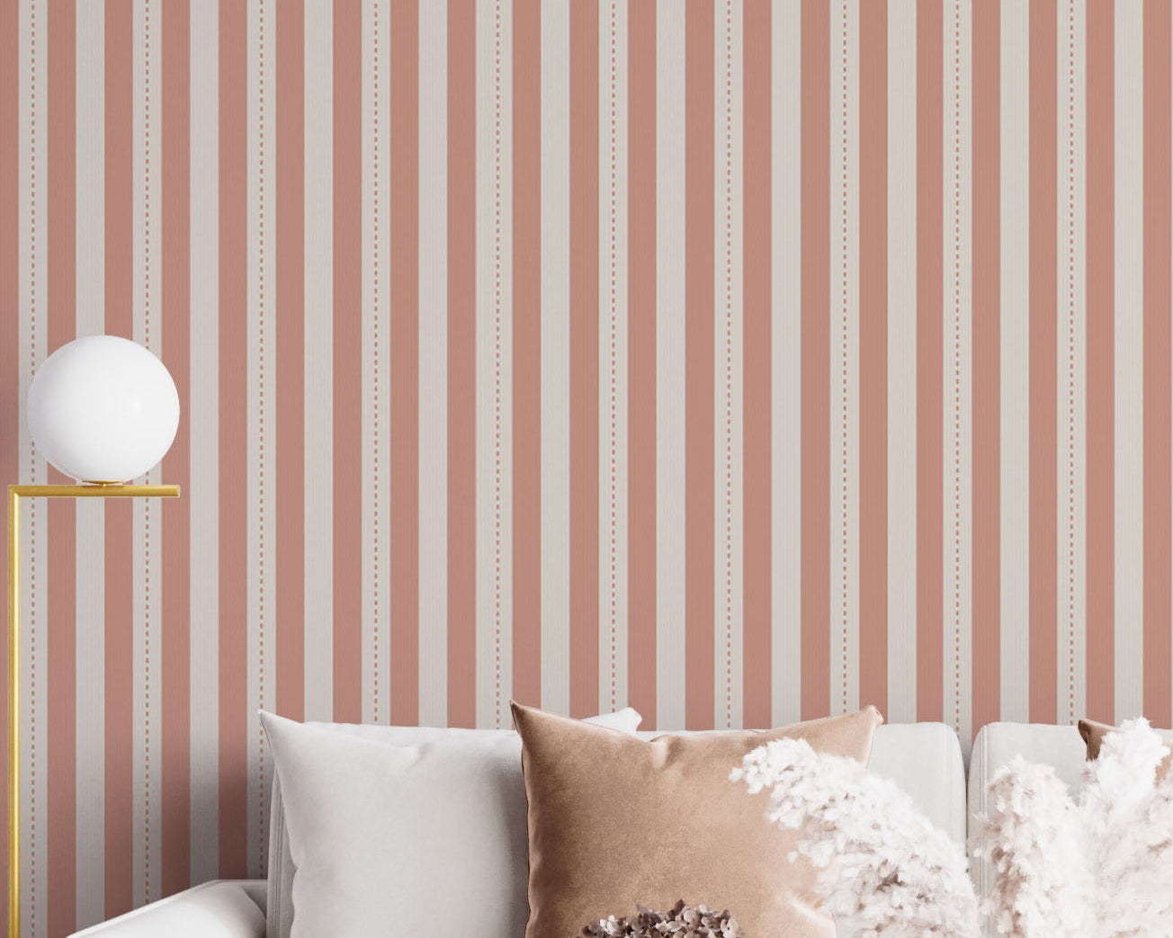 This Warm Peach and white striped wallpaper brings a bold yet elegant charm to any space. The sleek design enhances both modern and classic interiors, making a statement with its striking contrast and refined detailing.