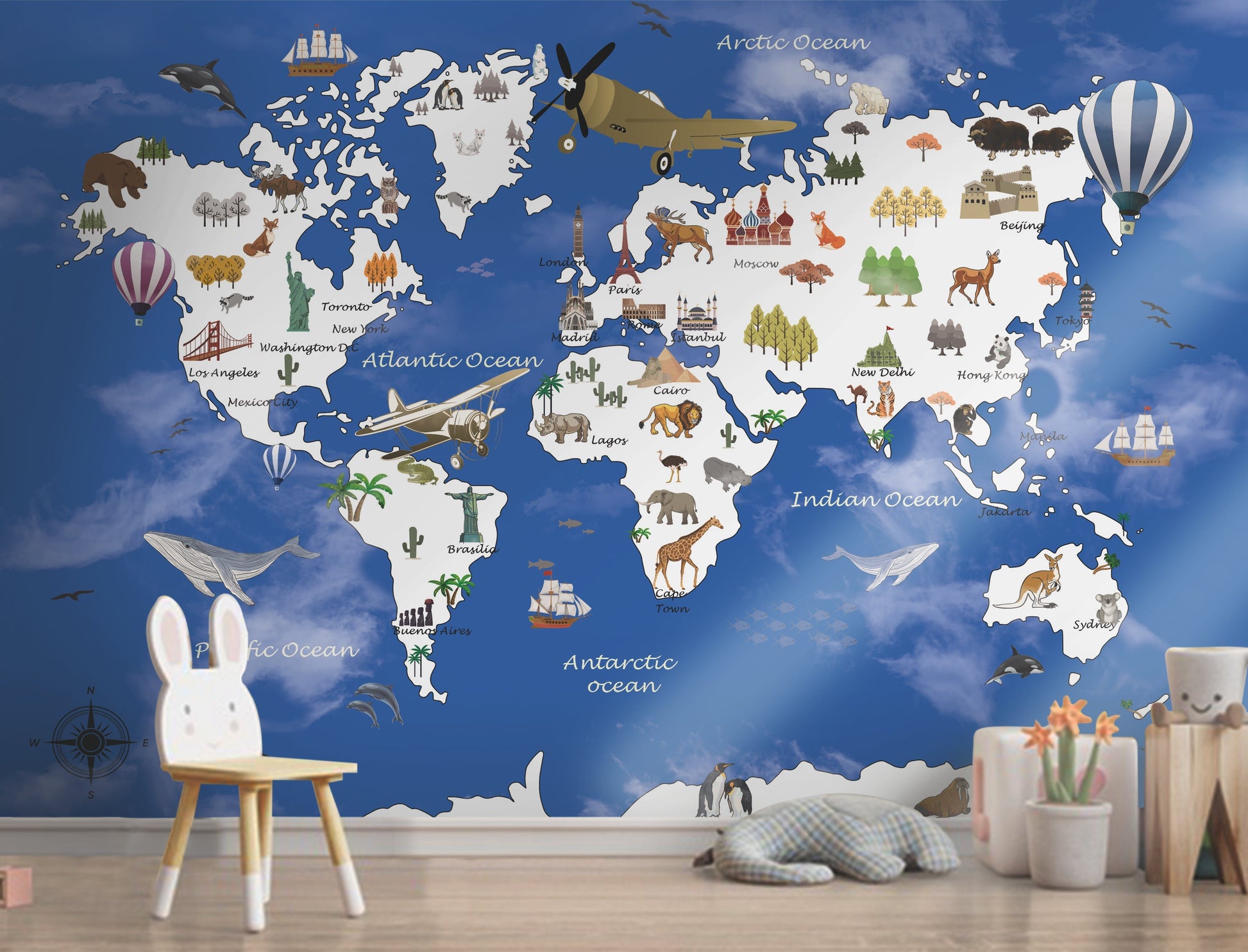 Inspire curiosity and a love for travel with this playful and informative world map mural, perfect for young explorers and budding geographers.