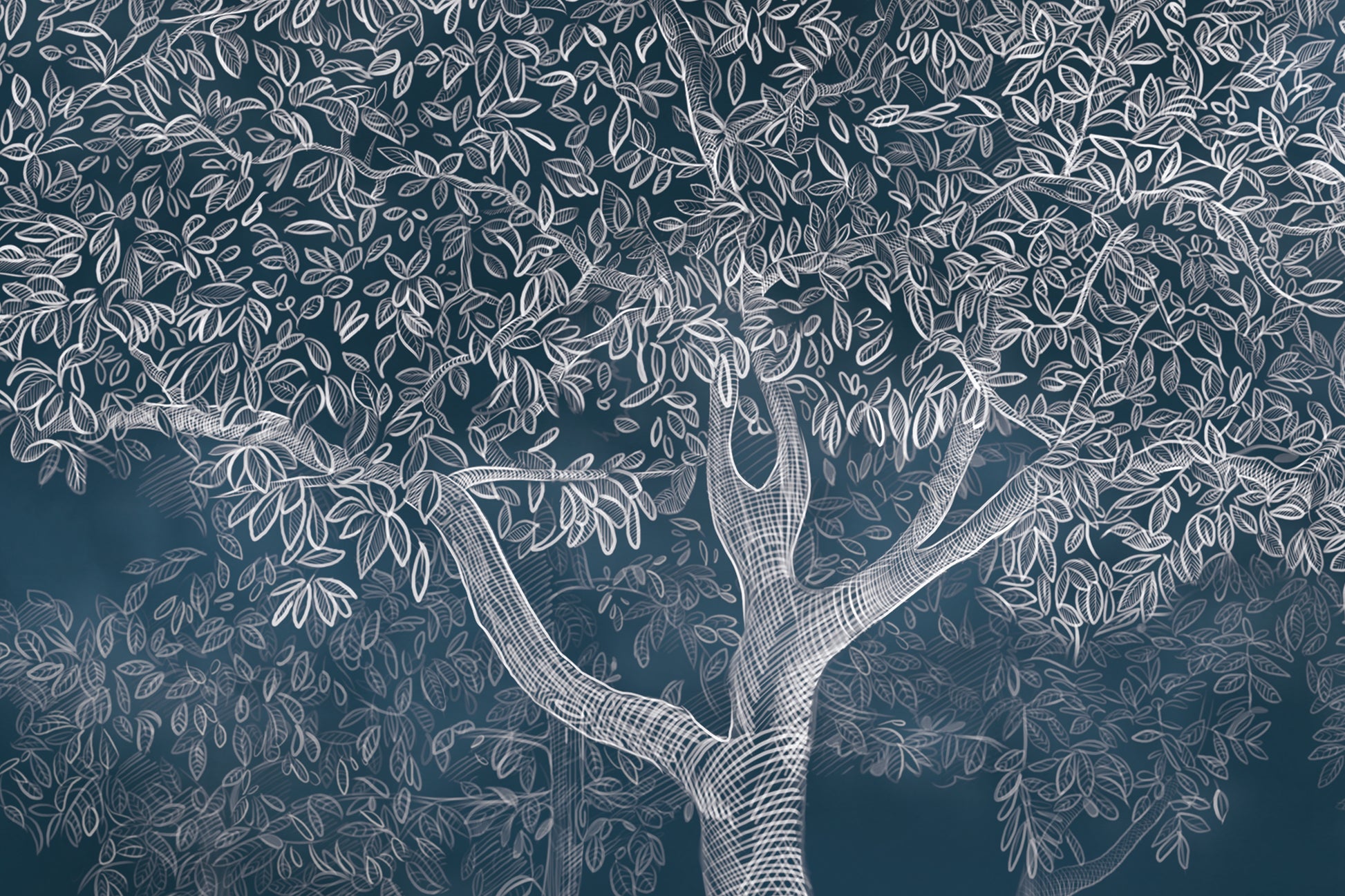 "Delight in the exquisite intricacy of the Aranyam wallpaper, where meticulously rendered trees evoke a sense of ethereal tranquility."