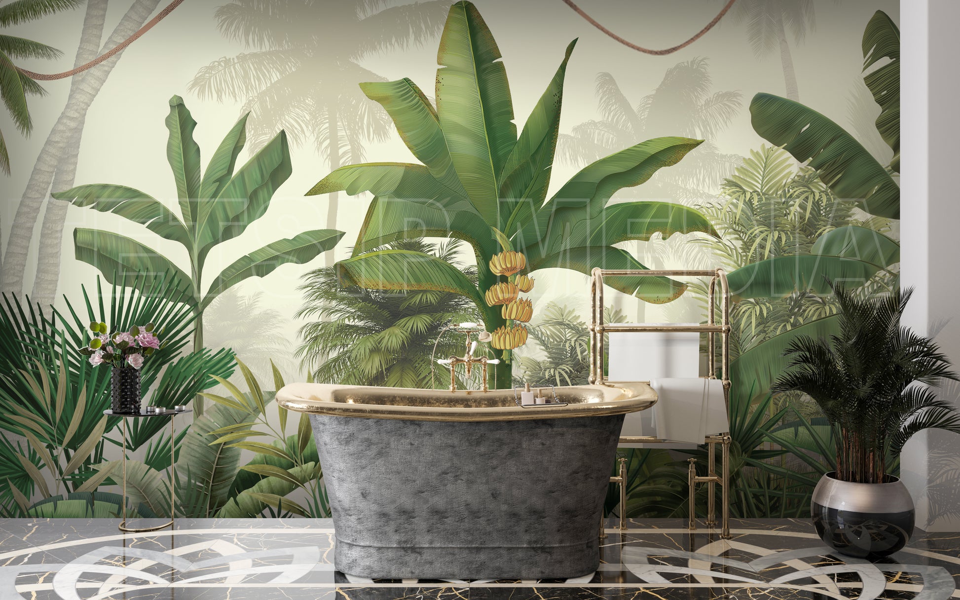"Step into a verdant wonderland with Tropical Forest II wallpaper, where banana trees sway gracefully amidst a rich tapestry of diverse foliage against a backdrop of towering coconut trees. Let the tranquil ambiance of this lush retreat fill your space, inviting you to lose yourself in the enchanting embrace of nature's bounty."