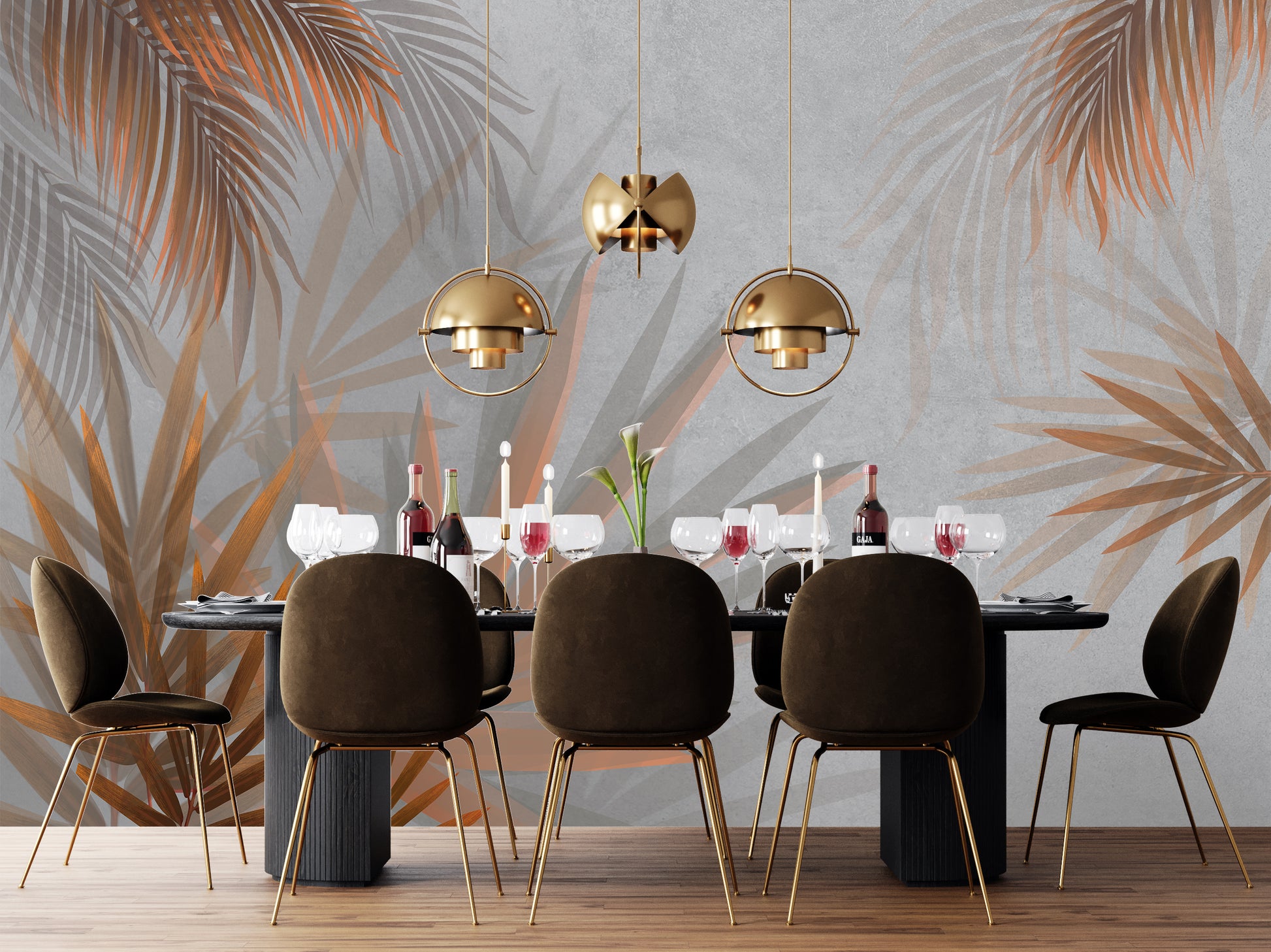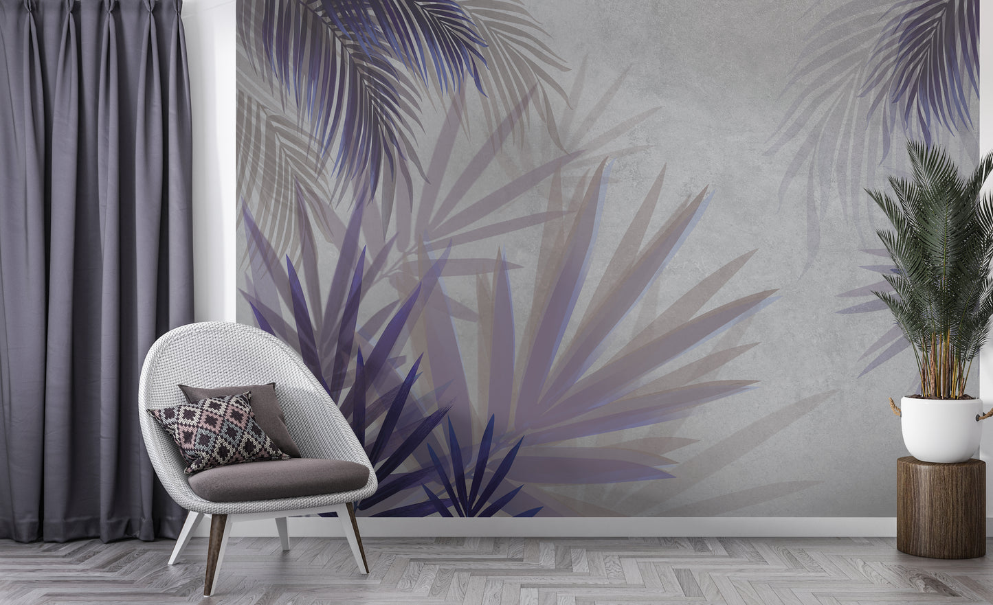 Create a serene sanctuary with Calm wallpaper, featuring elegant palm leaves gently swaying against a sophisticated grey texture, bringing a touch of natural tranquility to your space.