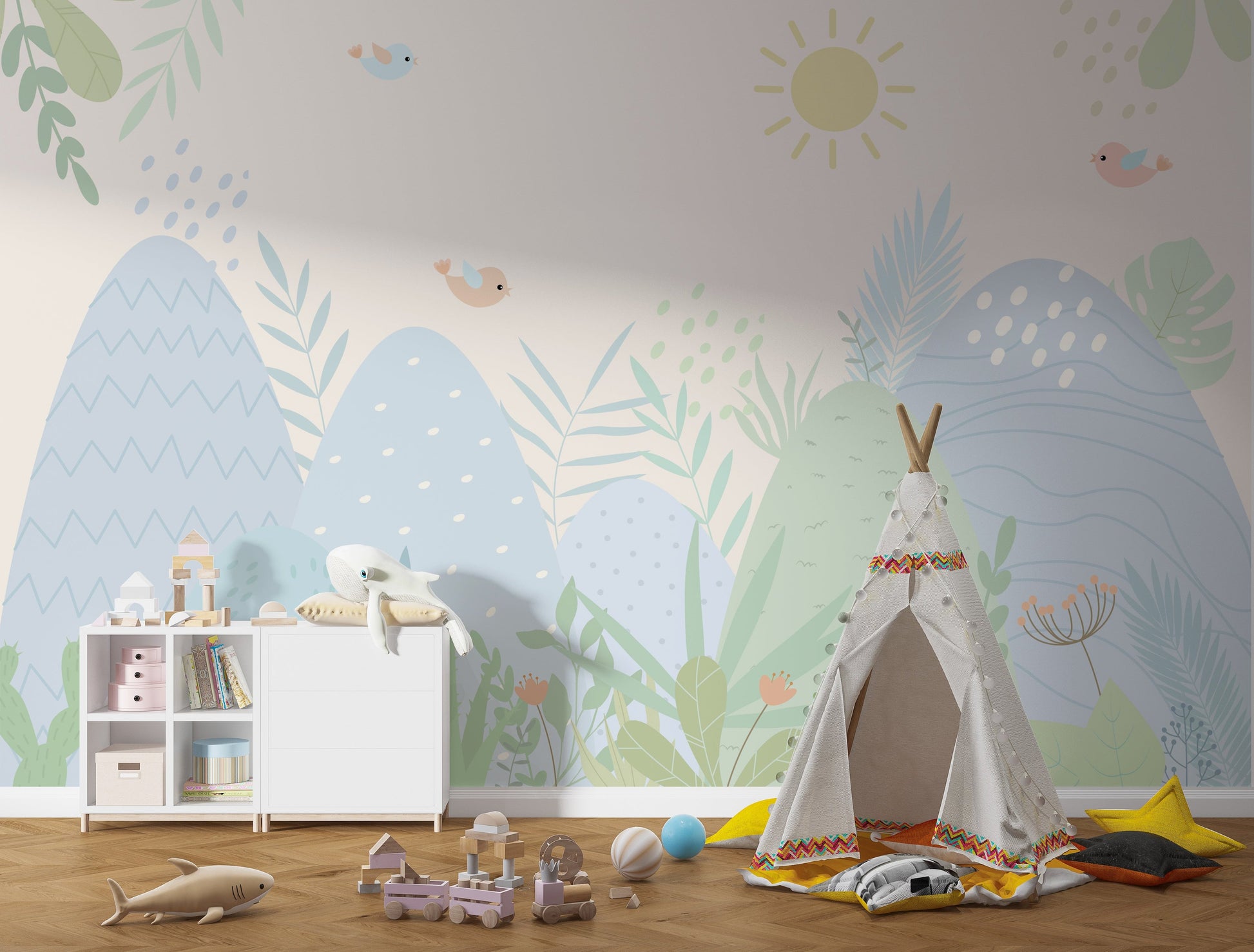 "Surrounded by pastel mountains and playful designs, their room becomes a haven of wonder and sunshine."