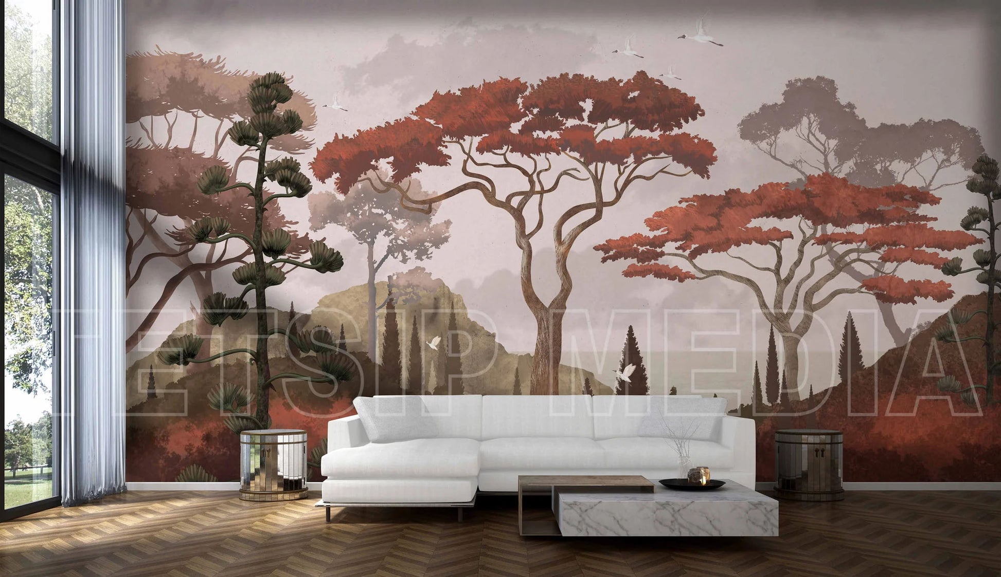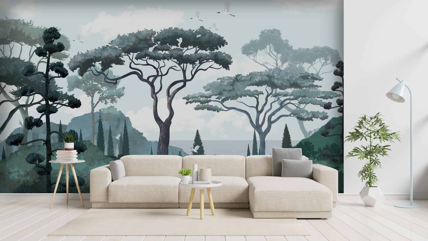 "Embark on a visual odyssey with Tropical Landscape wallpaper, where a symphony of palm trees, ancient oaks, and foliage dance beneath the watchful gaze of majestic mountains, while tranquil waters weave through verdant valleys. Let this captivating scene transport you to a world of natural splendor, where every detail invites exploration and awe."