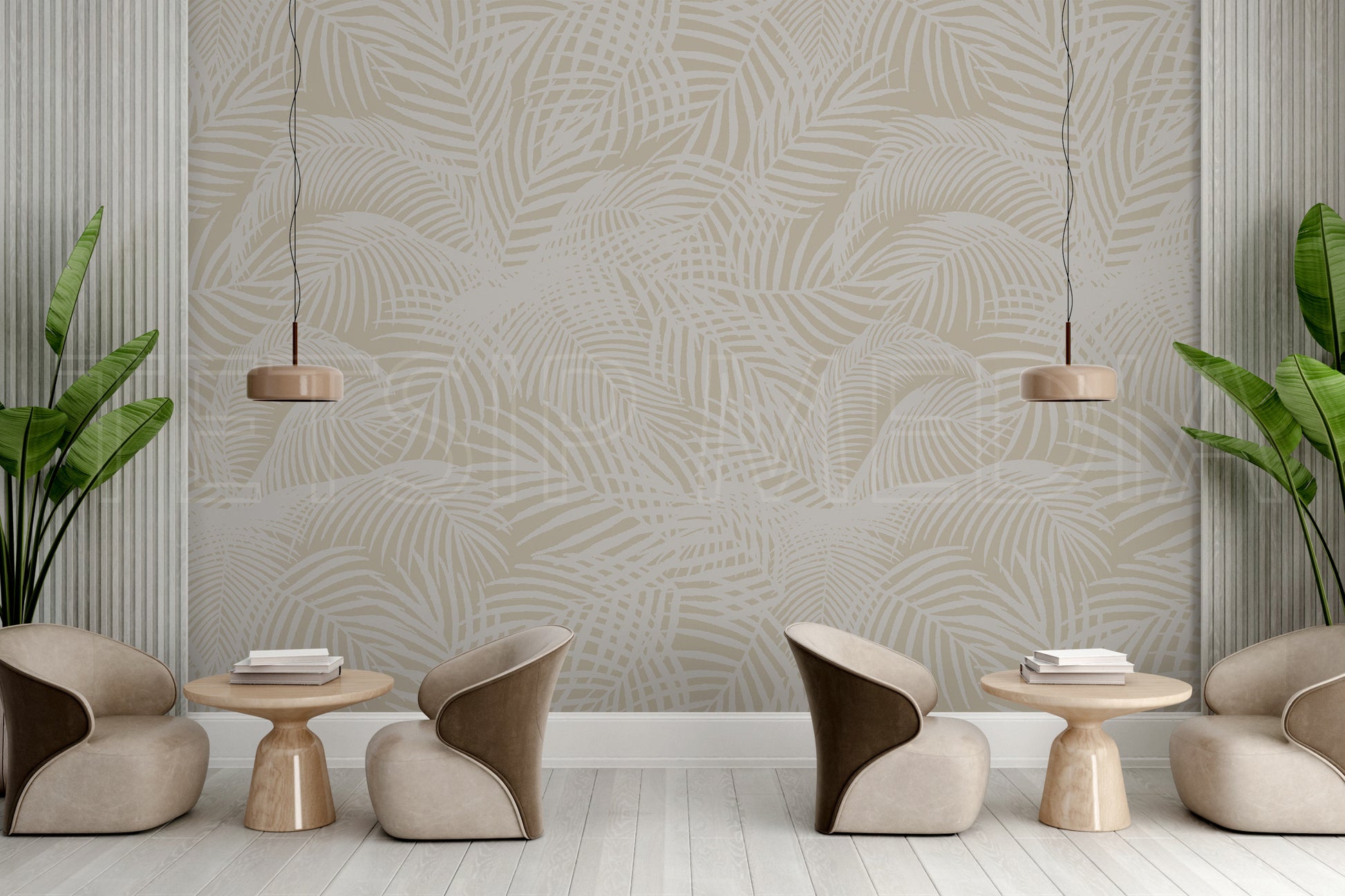 "Elevate your interior with our Tropical Leaves wallpaper, featuring intricate white foliage that exudes a timeless charm, adding a touch of sophistication to any room."