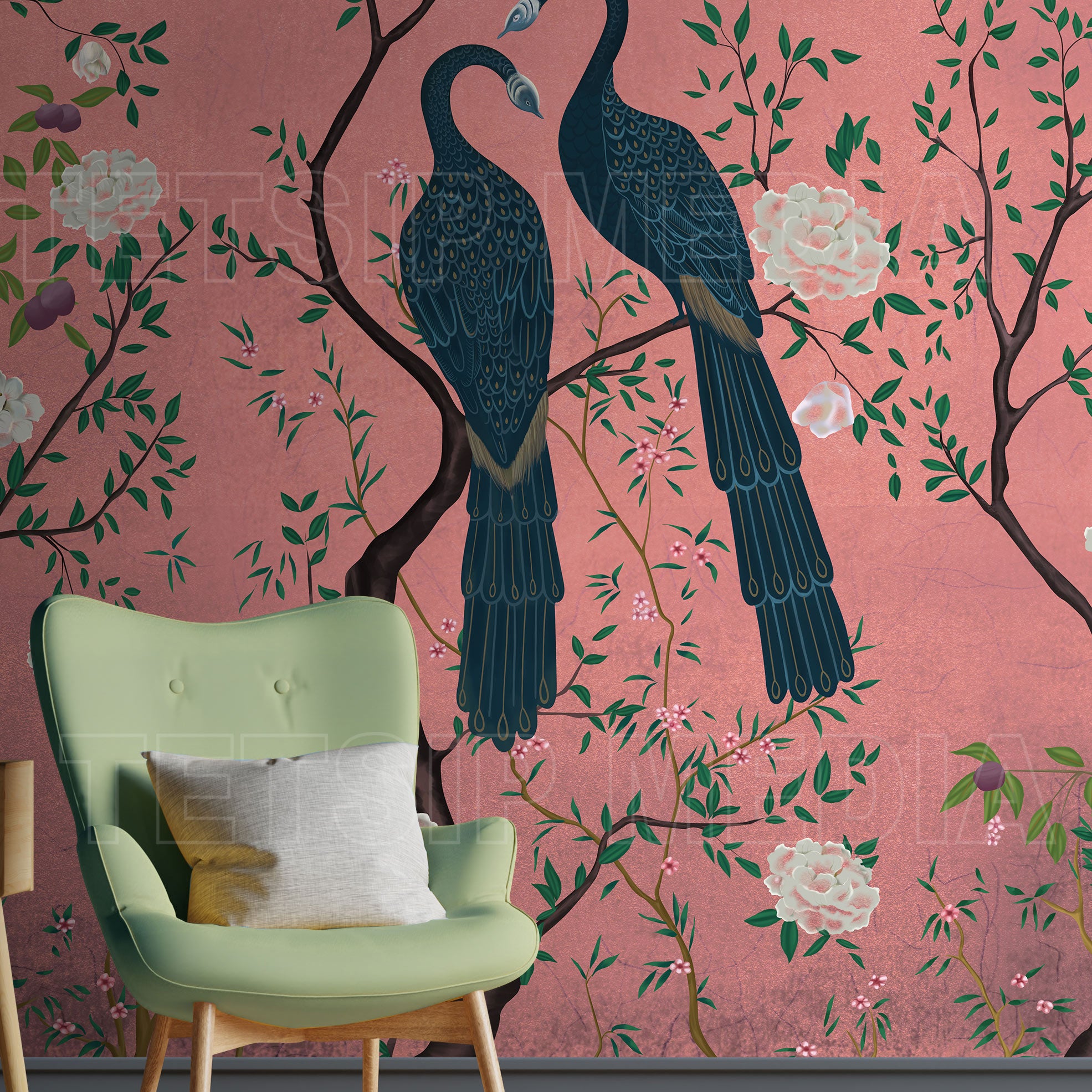 "Adorn your walls with the Vaatika III Wallpaper, showcasing intricate white blossoms,elelgant birds, delicate butterflies, and regal peacocks for a tranquil ambiance."