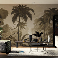 "Envelop your walls in the serene beauty of Luxe Tropical Greens wallpaper, where majestic coconut trees sway amidst a thriving , dense forest, creating a tranquil oasis in any room."
