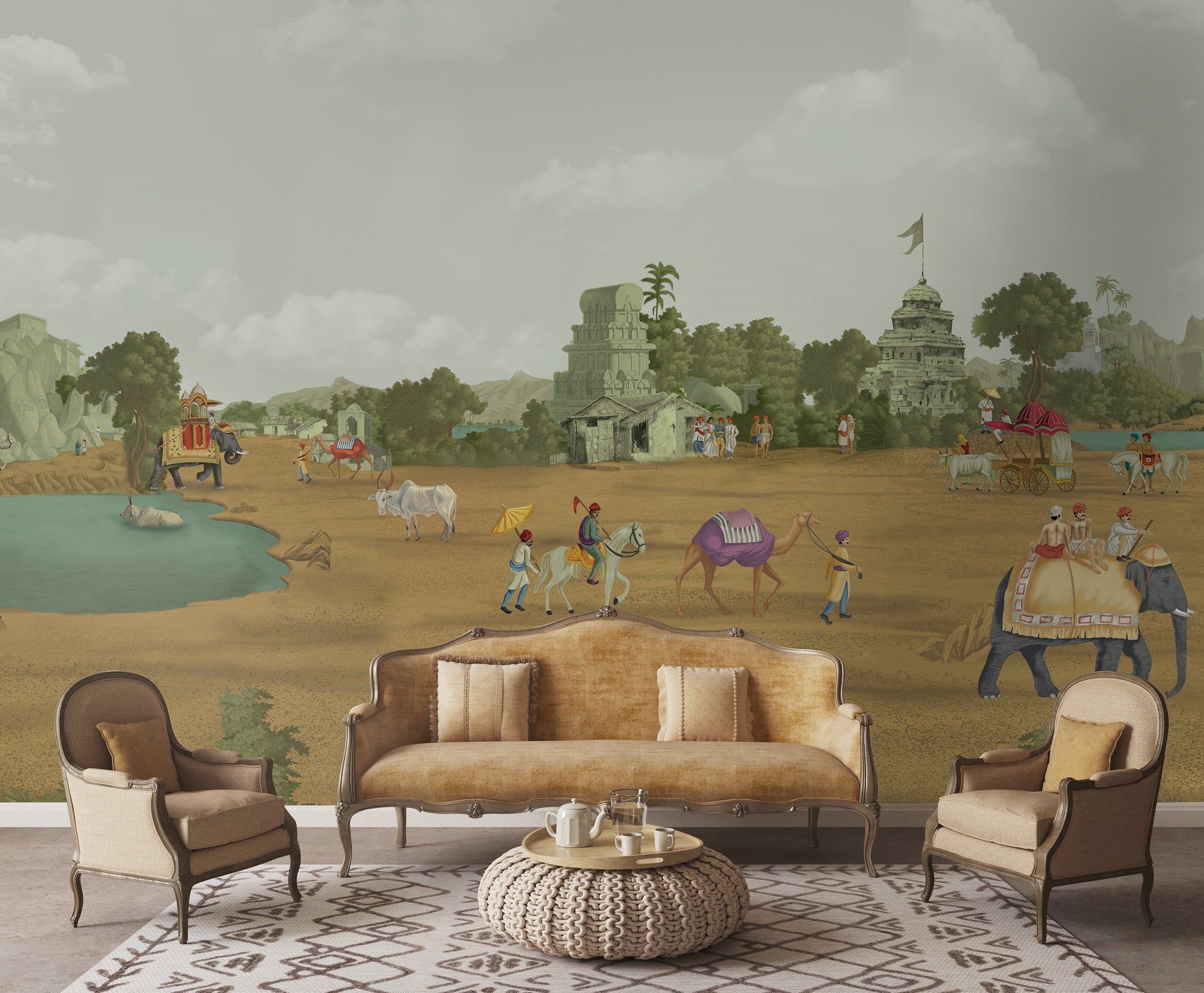 Capturing an ancient Indian village, this mural displays grand temples, lush greenery, and tranquil waters. The detailed imagery of elephants and camels enriches the tapestry of India's cultural history.